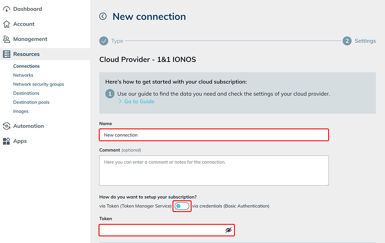 - Use the Radio button to select the authentication method. Decide whether you want to set up your subscription using tokens (Token Manager Service) or login data (Basic Authentication) and enter your IONOS access data accordingly.