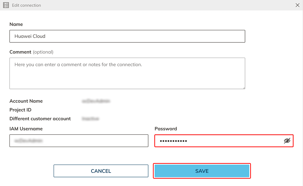 If you enter a project ID, only the one project is available. In order to have all projects to choose from, do not enter a project ID. - Click Save in oneclick™. Your Huawei subscription is now linked and existing resources are read out. You will only be charged when using virtual, machines.