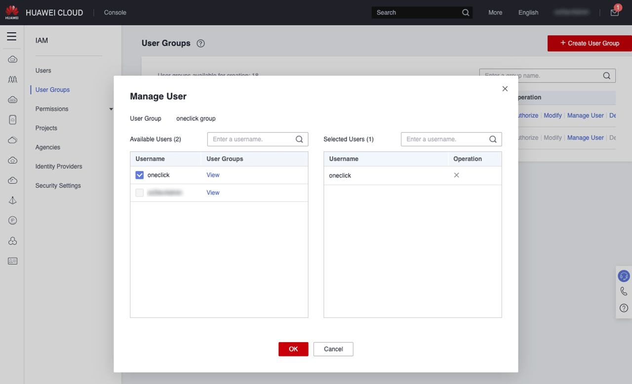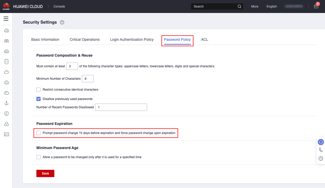 - Change the password in the Huawei Cloud by going to your created User and change the Password under “Security Settings”