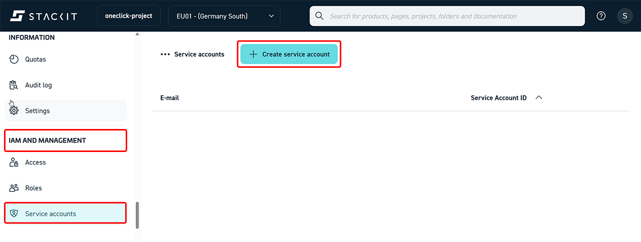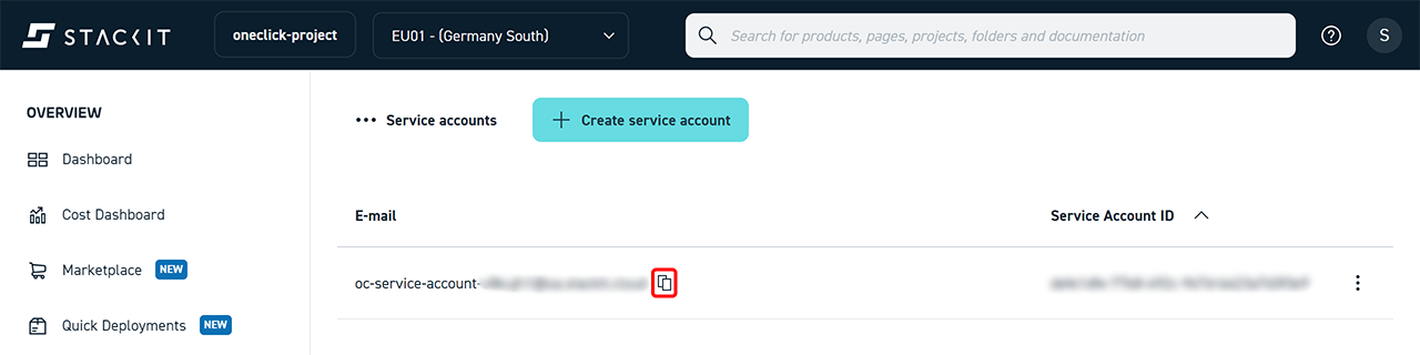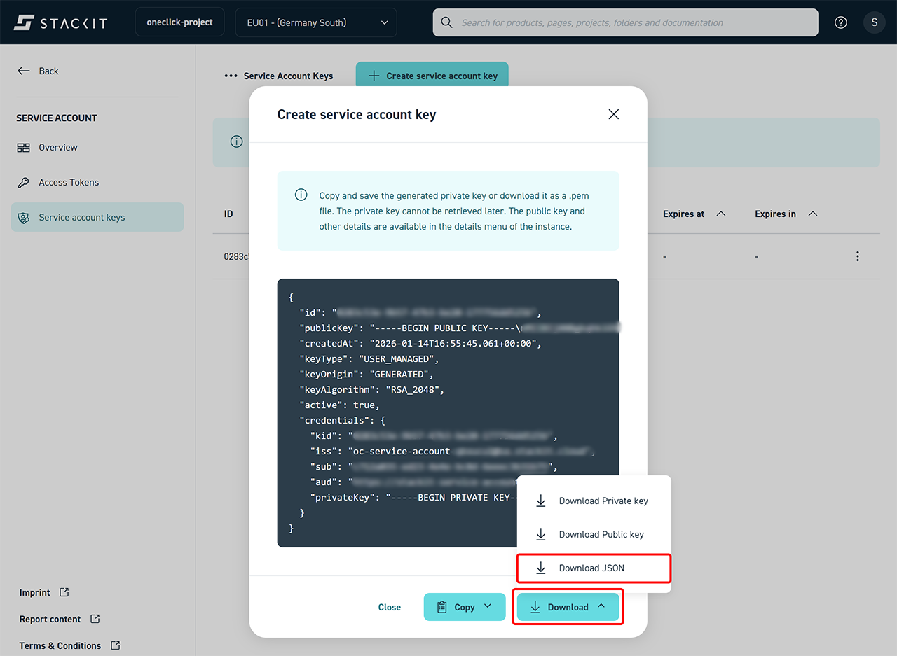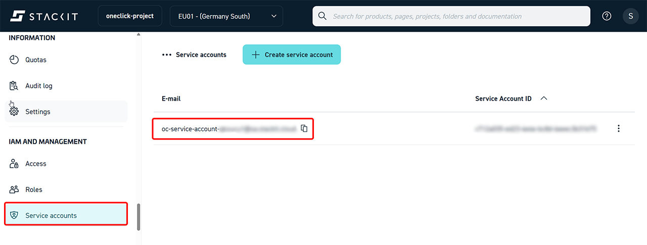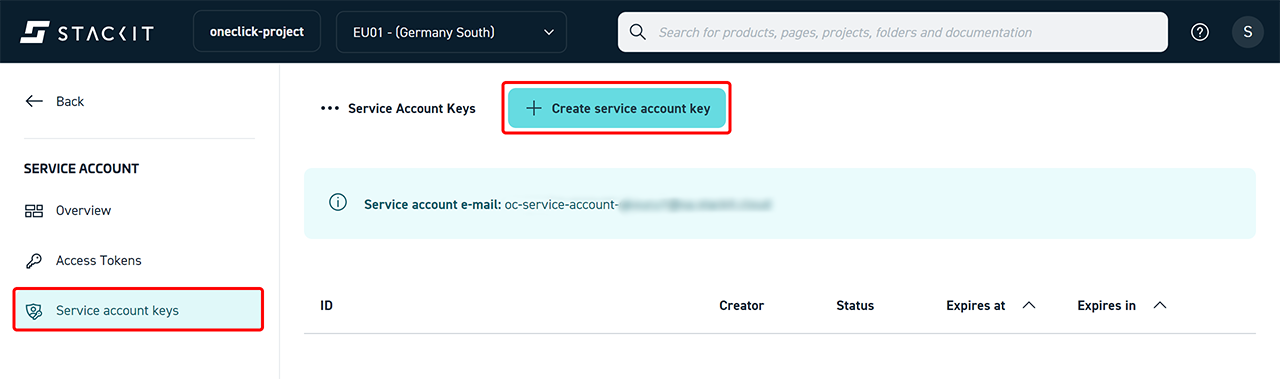 To allow oneclick™ to authenticate with STACKIT, you must generate credentials for the service account.