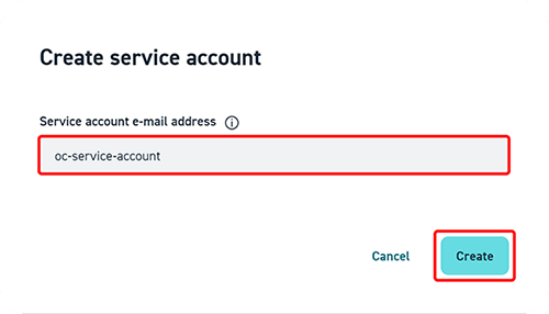 - Assign a unique name, for example “oc-service-account”. Only the name (prefix) needs to be specified. The full service account email address is automatically generated by StackIT and assigned to the service account.