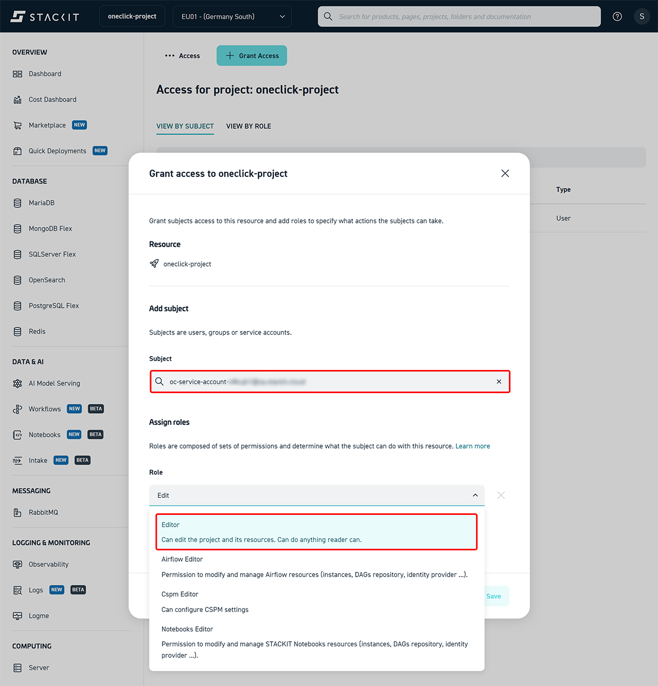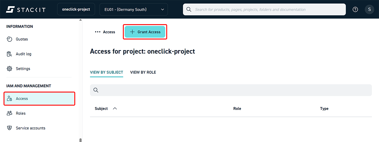 If you want to use an existing StackIT subscription in oneclick™, oneclick™ must be able to access this project via the StackIT APIs.