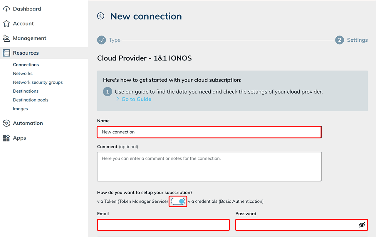 - Verwenden Sie den Auswahlschalter , um die Authentifizierungsmethode auszuwählen. Entscheiden Sie, ob Sie Ihr Abonnement mittels Token (Token Manager Service) oder über Anmeldedaten (Basic Authentication) einrichten möchten und geben Sie entsprechend Ihre IONOS Zugangsdaten ein.