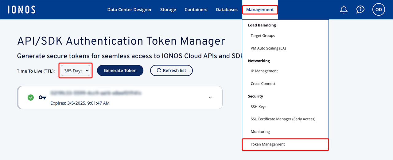 - Wenn Sie die Methode mit Authentifikationstoken wählen, setzen Sie die Gültigkeit in Ihrem IONOS-Konto auf 365 Tage. Denken Sie daran, den Token vor Ablauf zu erneuern, da er ungültig wird.