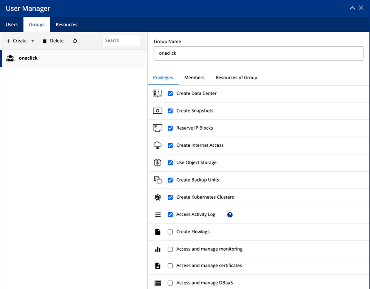 - Wenn Ihr Benutzer kein Administrator sein soll, klicken Sie auf Gruppen und erstellen Sie eine neue Gruppe mit folgendenen Rechten:
