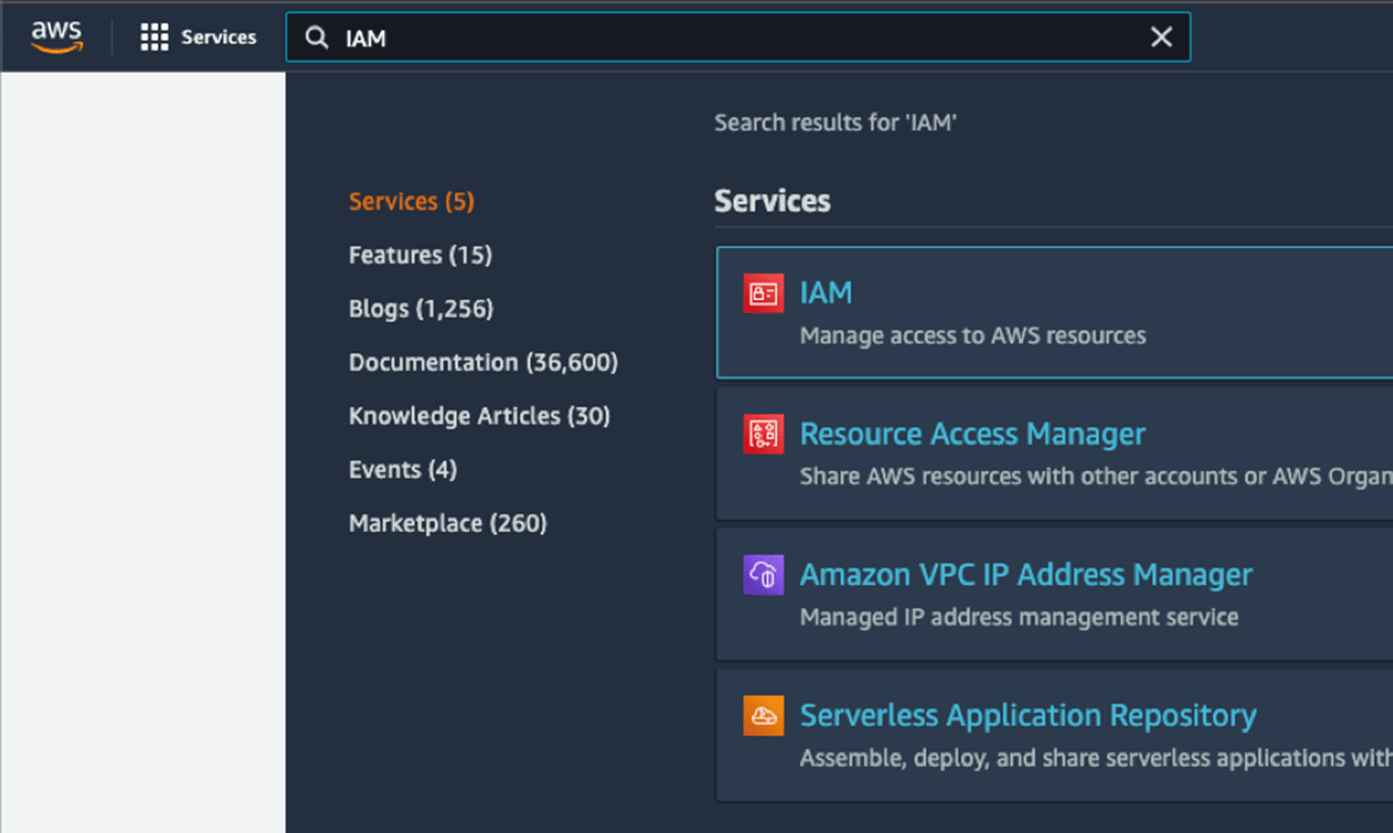 Suchen Sie in der Suchleiste nach “IAM” und klicken dann auf IAM.