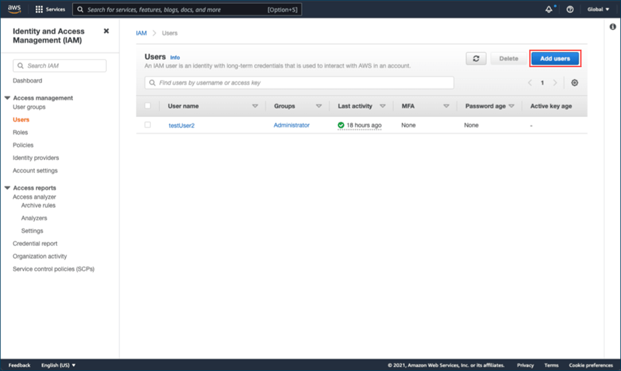 Nehmen Sie nur Ihren bereits bestehenden User, wenn Sie sich sicher sind, diesem auch “Programmatic access” gegeben zu haben. Legen Sie einen neuen Benutzer an, indem in den Punkt Users wechseln und dann oben rechts auf Create User klicken.