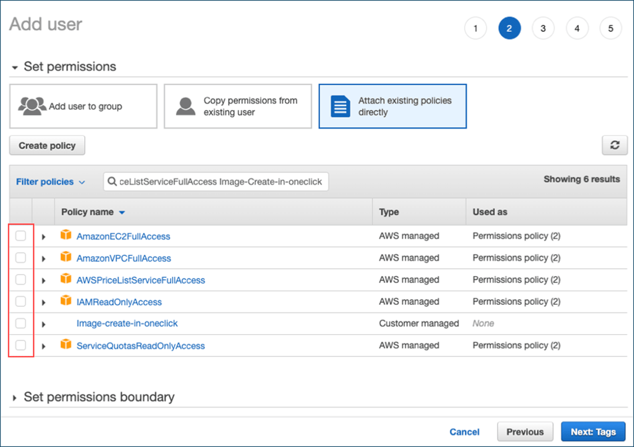 Klicken Sie auf Attach existing policies directly. Suchen Sie nach folgenden Policies, wählen diese aus und klicken auf Next.