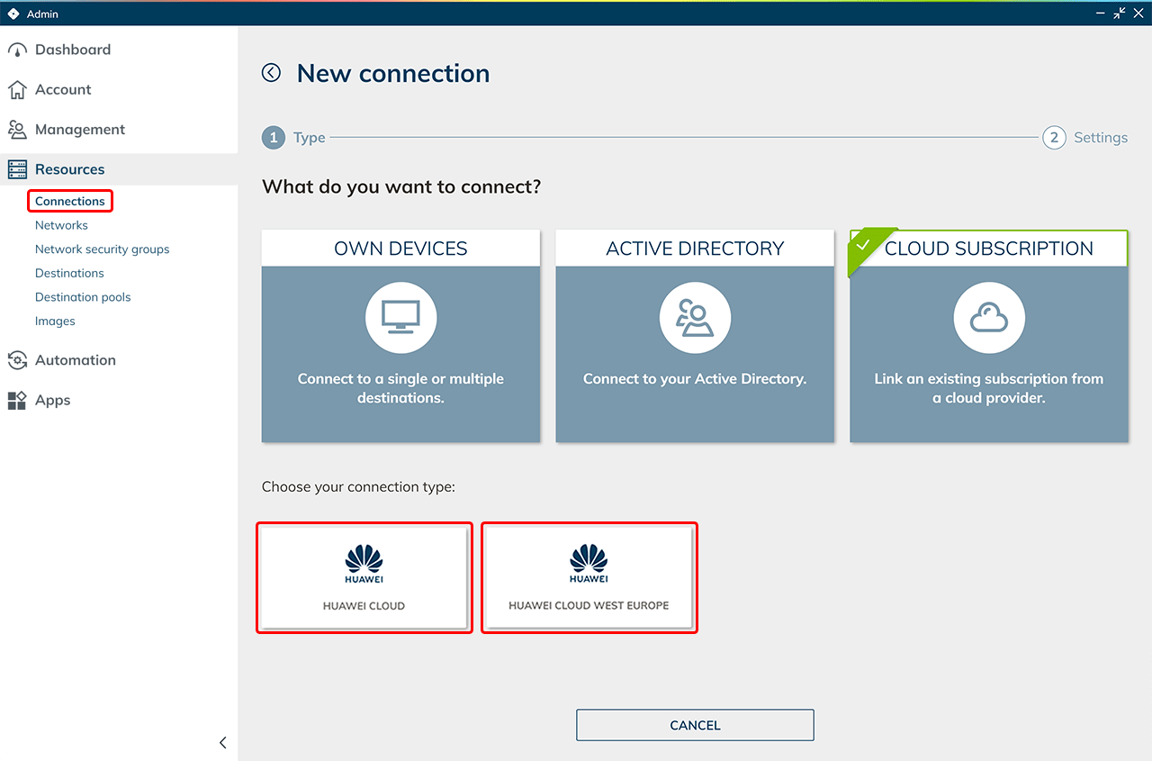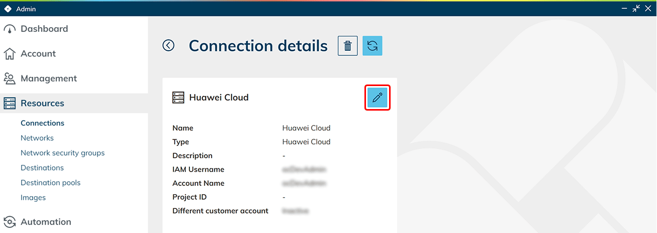 - Klicken Sie in oneclick™ auf Speichern. Ihr Huawei Abonnement ist nun verknüpft und vorhandene Ressourcen werden ausgelesen. Es entstehen erst Kosten bei der Nutzung von virtuellen Maschinen.