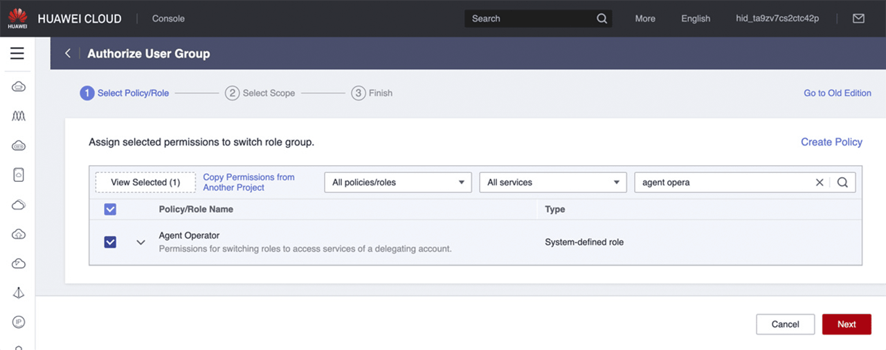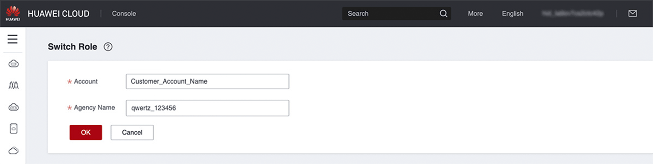 - Geben Sie der Anbindung einen beliebigen Namen und wählen “Abweichenden Kunden-Account verknüpfen” aus. Tragen Sie Ihre Partner-Account Daten und danach Ihre Kunden-Account Daten aus Ihrem Huawei Abonnement ein. Wenn Sie eine Projekt-ID eingeben, ist nur dieses eine Projekt verfügbar. Um alle Projekte zur Auswahl zu haben, geben Sie keine Projekt-ID ein.