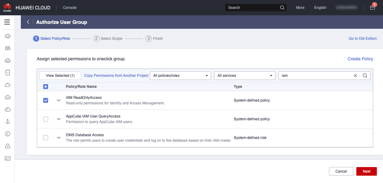 - Suchen Sie nach der Berechtigung “IAM ReadOnlyAccess” und klicken Sie auf Next.