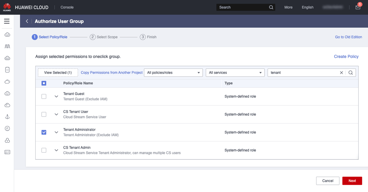 - Klicken Sie erneut auf Authorize und suchen Sie nach der Berechtigung “Tenant Administrator”, wählen diese aus und klicken Sie anschließend auf Next.