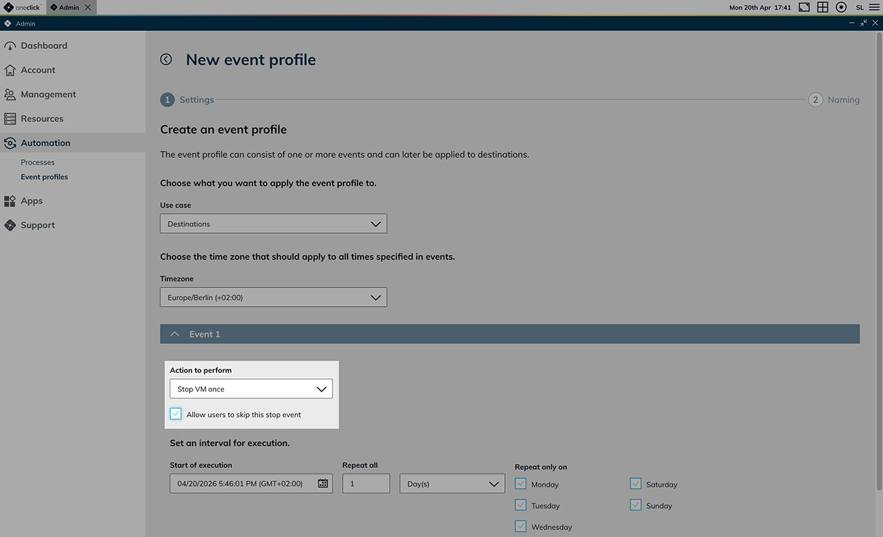 Eine neue Option in den Ereignisprofil-Einstellungen ermöglicht es Benutzern, geplante VM-Stopp-Ereignisse zu überspringen. Wenn aktiviert, erscheint ein „Nächsten Stopp überspringen"-Link auf der Kachel des Benutzers. Mehrere aufeinanderfolgende Stopps können übersprungen werden, und läuft bereits eine Abschaltbenachrichtigung, wird der ausstehende Stopp abgebrochen.