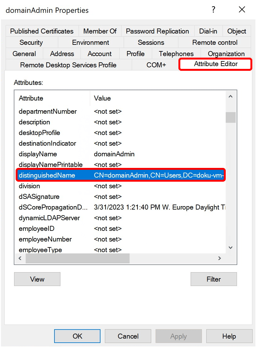 Scrollen Sie nach unten bis zum Eintrag „distinguishedName“.