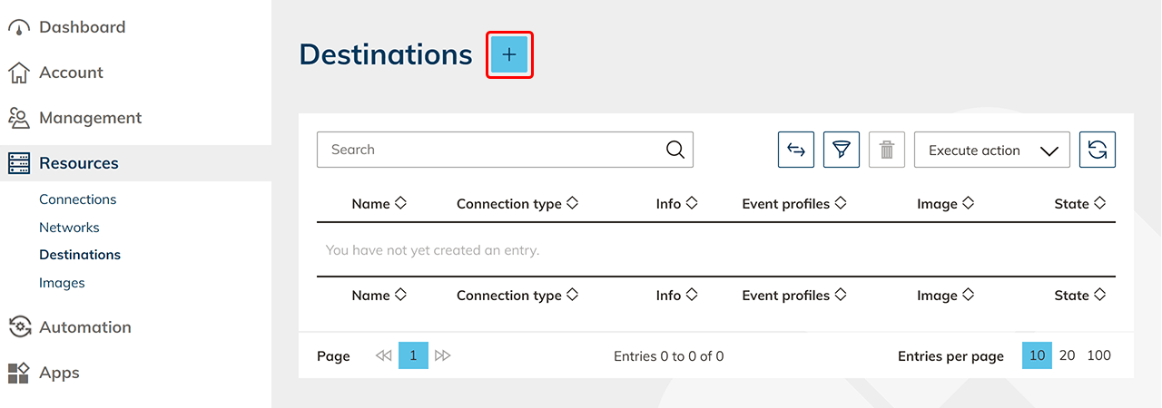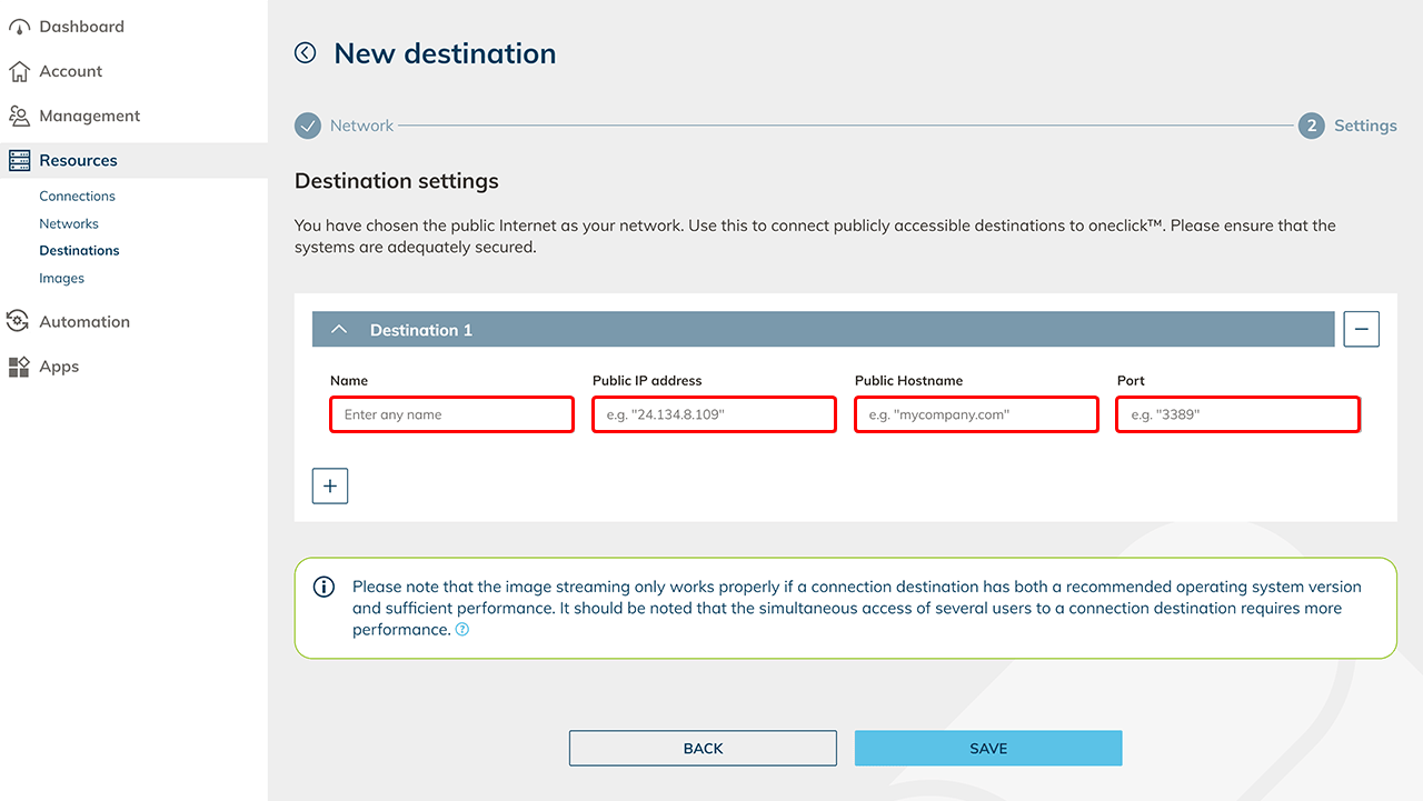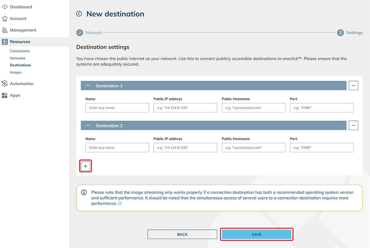 - Starten Sie in oneclick™ direkt über den Reiter Ressourcen im Punkt Zielsysteme. Klicken Sie auf das + Symbol um ein neues Zielsystem mit direktem Internetzugang anzulegen.