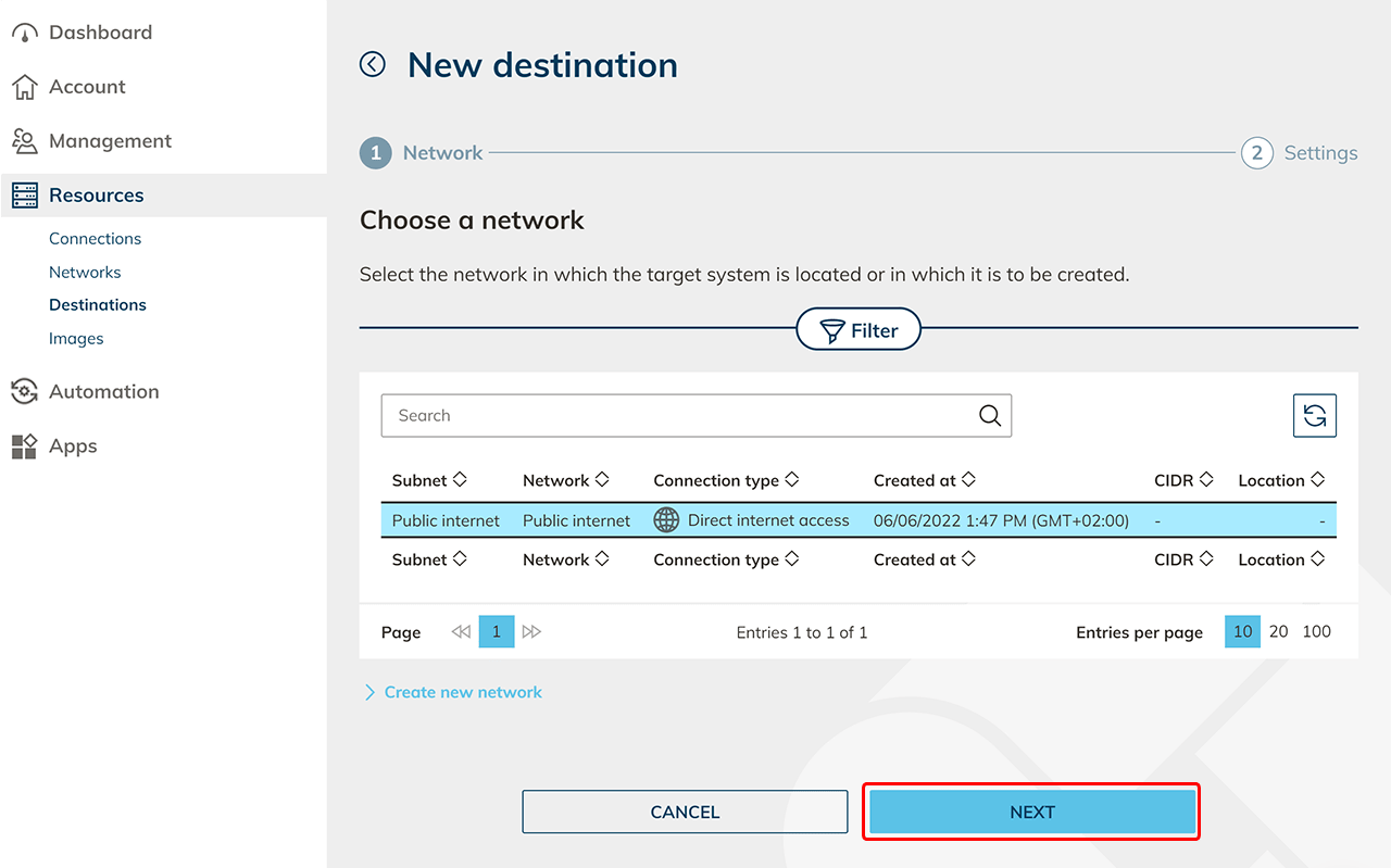 - Wählen Sie das Netzwerk Öffentliches Internet aus und klicken Sie auf Weiter. Dieser Netzwerkeintrag ist per default bereits vorhanden.