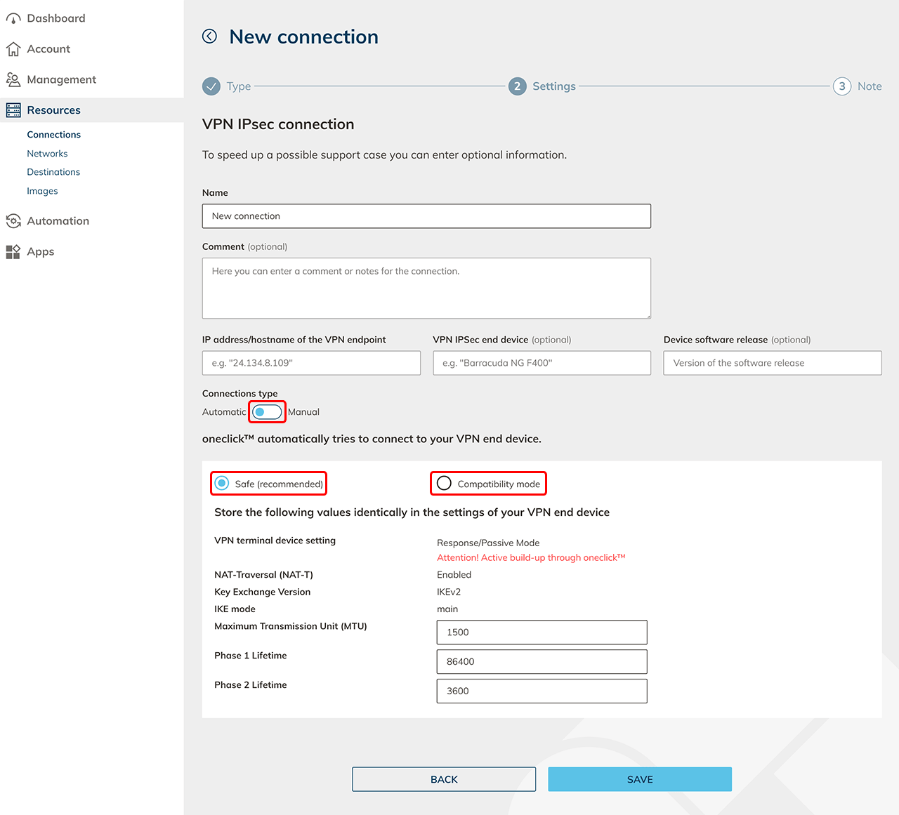 - Im automatischen Modus können Sie zwischen Sicher (empfohlen) mit der IKE Version 2 und dem Kompatibilitätsmodus mit der IKE Version 1 wählen. Hierbei versucht oneclick™ automatisch eine Verbindung mit Ihrem VPN Endgerät aufzunehmen.
