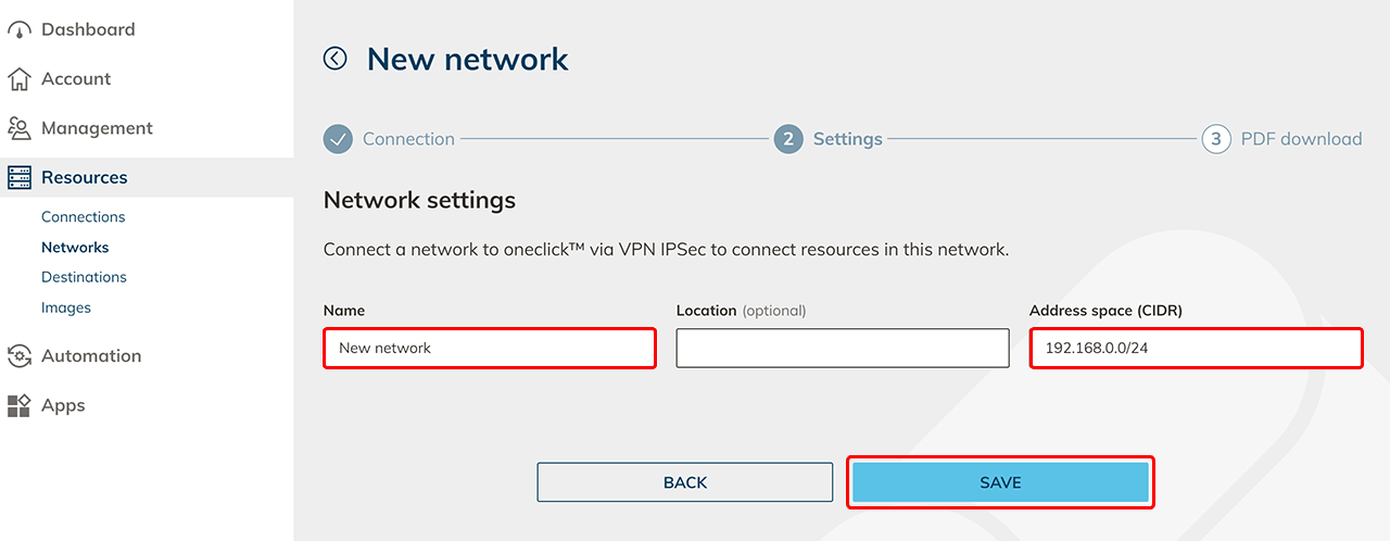 Geben Sie dem Netzwerk einen beliebigen Namen. Tragen Sie optional einen Standort, für die besseren Übersicht in Tabellen, und den Adressraum (CIDR) ein und klicken Sie anschließend auf Speichern.