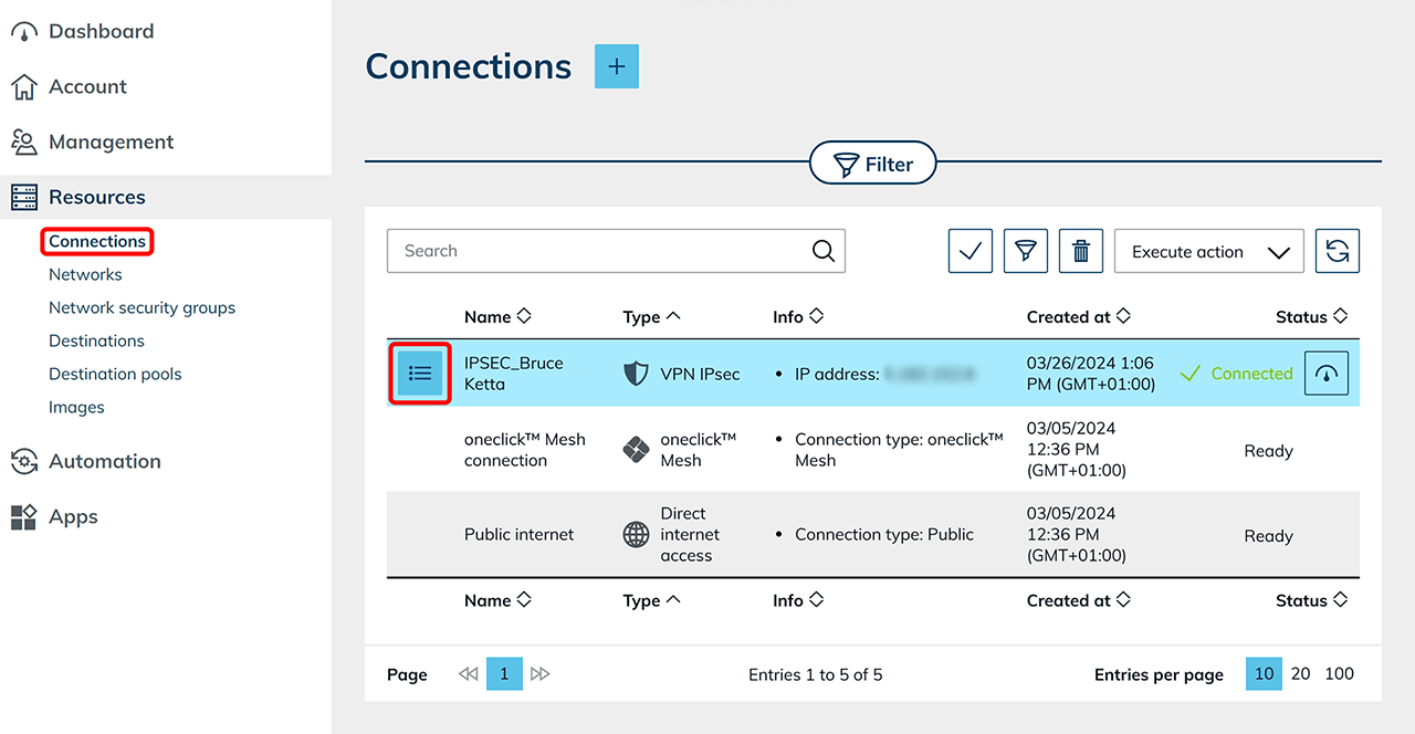 - Suchen Sie die gewünschte VPN-Verbindung in der Liste. Klicken Sie in der entsprechenden Zeile auf das Listen-Symbol, um die Detailansicht zu öffnen.