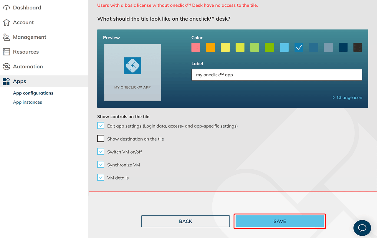 - Für Professional Benutzer können Sie die Kachel auf dem Unified Workspace farblich anpassen, die Beschriftung ändern und das Icon festlegen.
