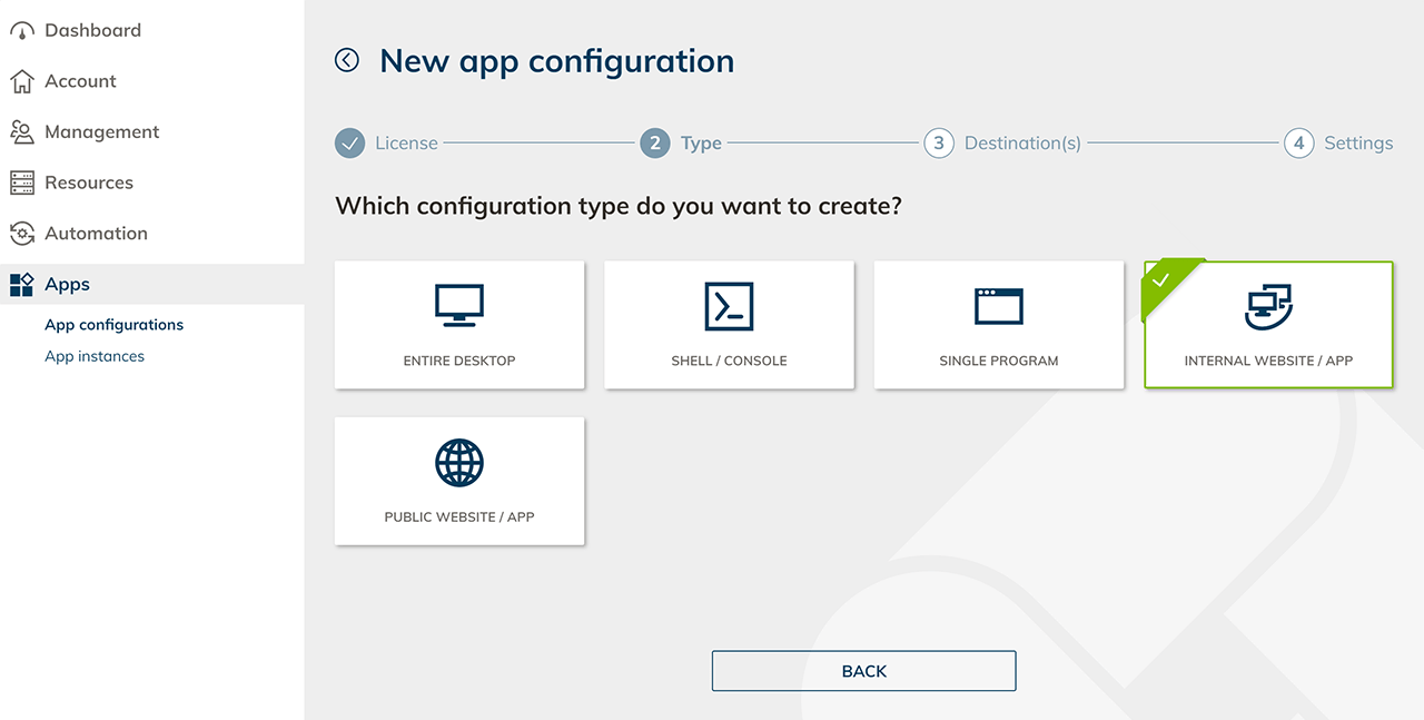 - Im nächsten Schritt können Sie den passenden Konfigurationstyp (interne Website / App) für den Zugriff auf Ihre Ressourcen wählen.