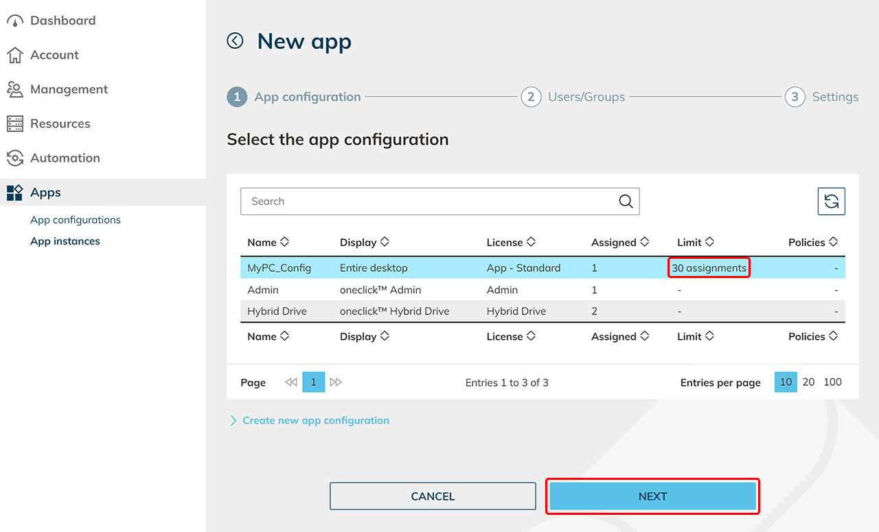 Wählen Sie die App-Konfigurationen aus, von denen der Benutzer eine Instanz erhalten soll und klicken auf Weiter.
