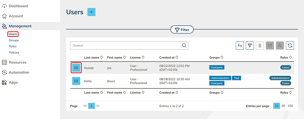 Klicken Sie im Menü auf den Reiter Verwaltung und dann auf Benutzer. Klicken Sie in der Zeile des Benutzers, dem Sie Apps zuweisen möchten, auf das Listen-Symbol, um auf die Detailseite zu gelangen.