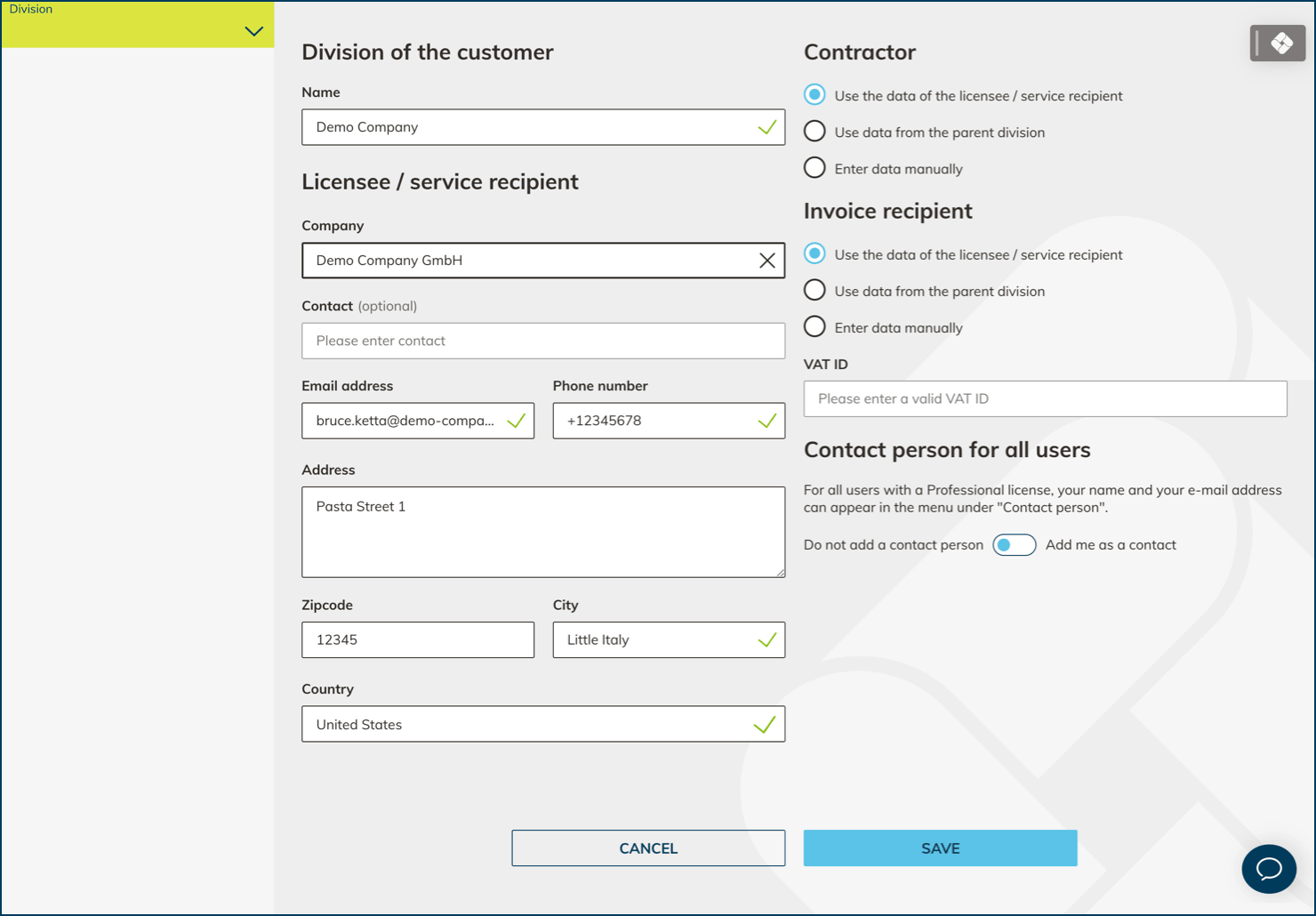 - Optional können Sie sich selbst als Ansprechpartner und Ihren Verantwortungsbereich (z.B. Support) eintragen. Die Daten sind für alle Professional-Benutzer und Administratoren sichtbar.