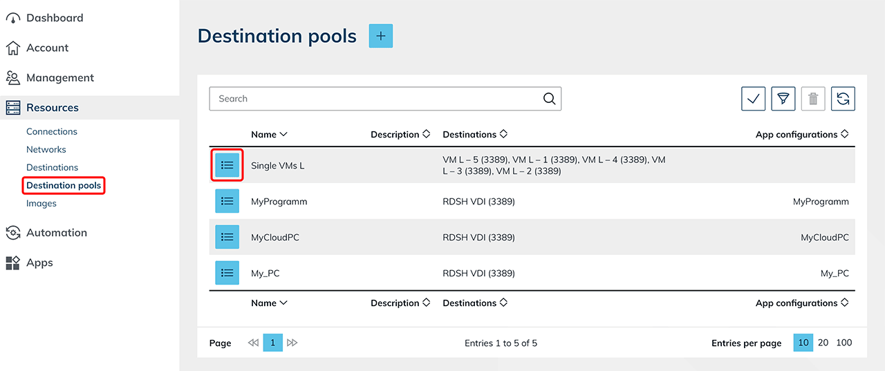 - Im Reiter Ressourcen gehen Sie auf Zielsystem-Pools und klicken dann auf das Listen-Symbol, um zur Detailseite zu gelangen.