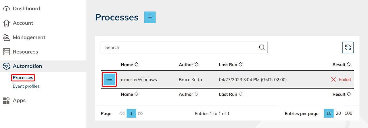 - Durch einen Klick auf das Listen-Symbol neben „exporterWindows“ gelangen Sie zur Detailseite des Prozesses.