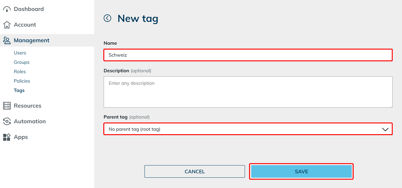 - Wählen Sie optional ein Eltern-Tag aus, um das neue Tag als untergeordnetes Tag (Kind-Tag) einzuordnen.