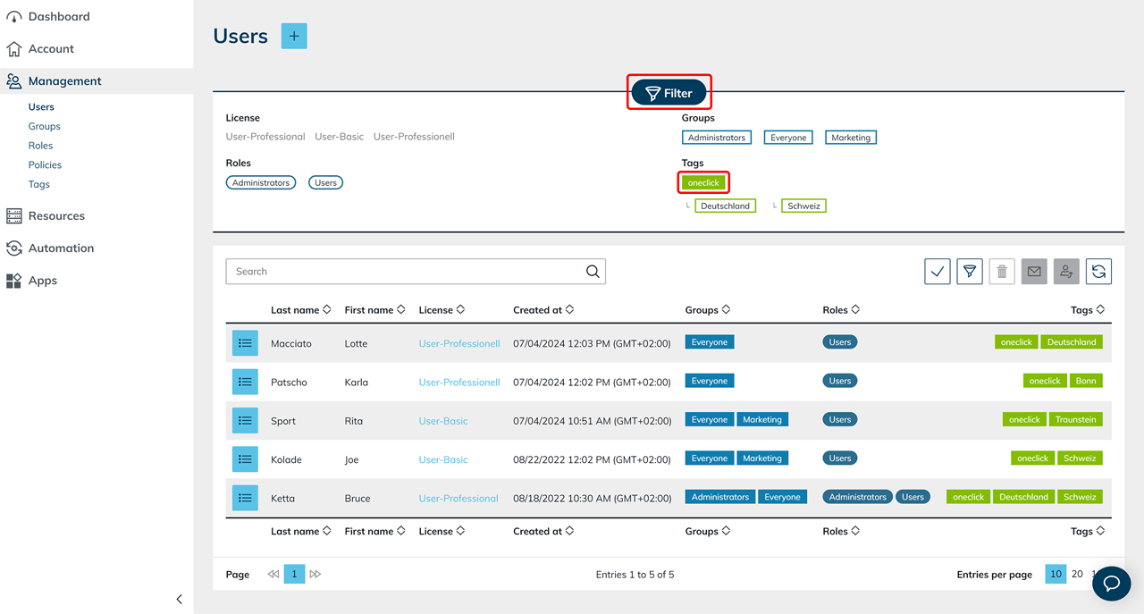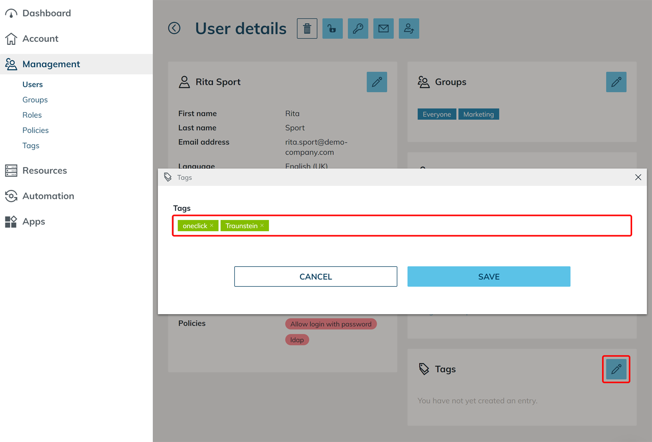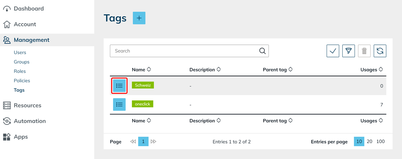 Tags werden in den Bereichen Account, Verwaltung, Ressourcen, Automatisierung und Apps eingesetzt, um Objekte übersichtlich zu organisieren und Zusammenhänge schneller zu erkennen.