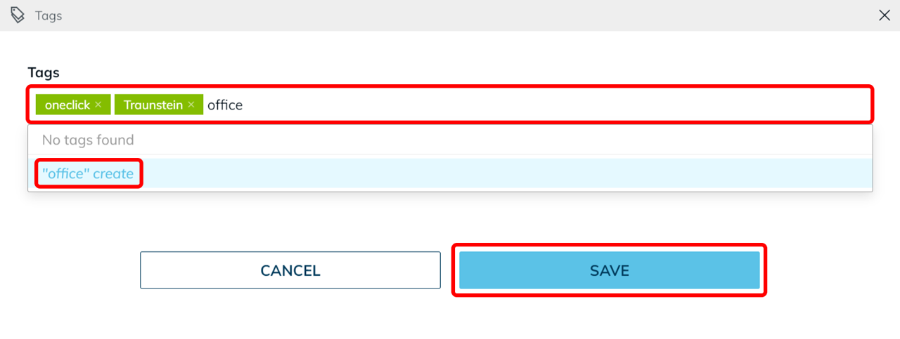 Klicken Sie auf "Name erstellen", um ein neues Tag anzulegen, oder bestätigen Sie die Eingabe mit Enter. Drücken Sie Escape, um die Eingabe abzubrechen, oder Delete, um ein Tag zu entfernen. - Speichern Sie die Änderung.