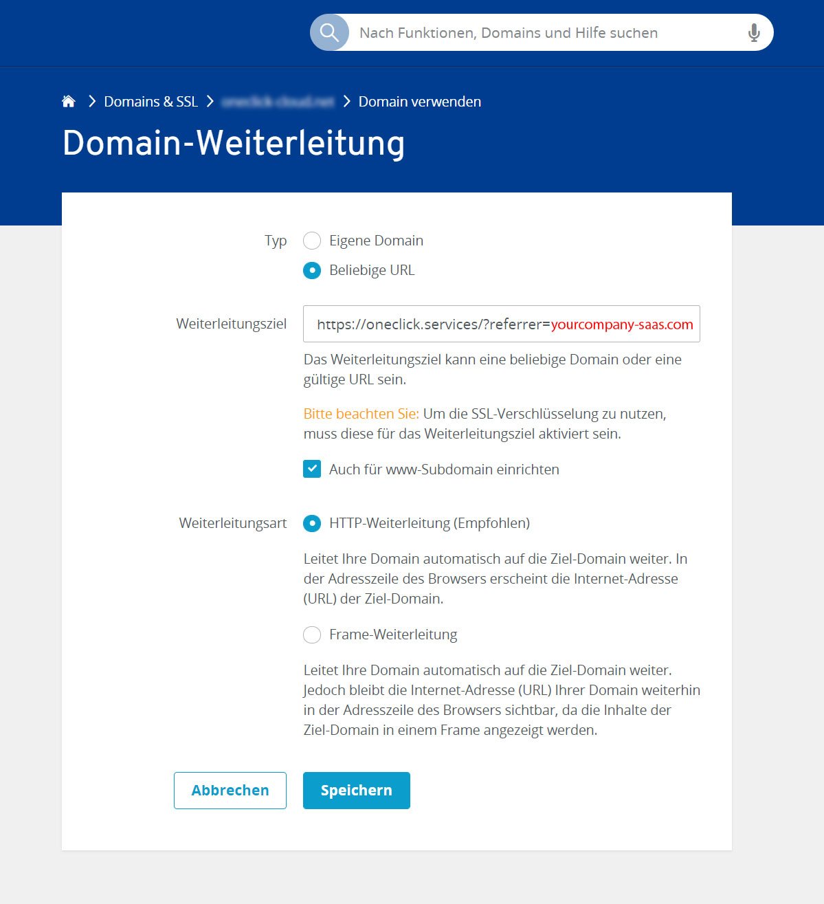 Leiten Sie Ihre Domain auf die oneclick URL mit Ihrem “Referrer” um.
