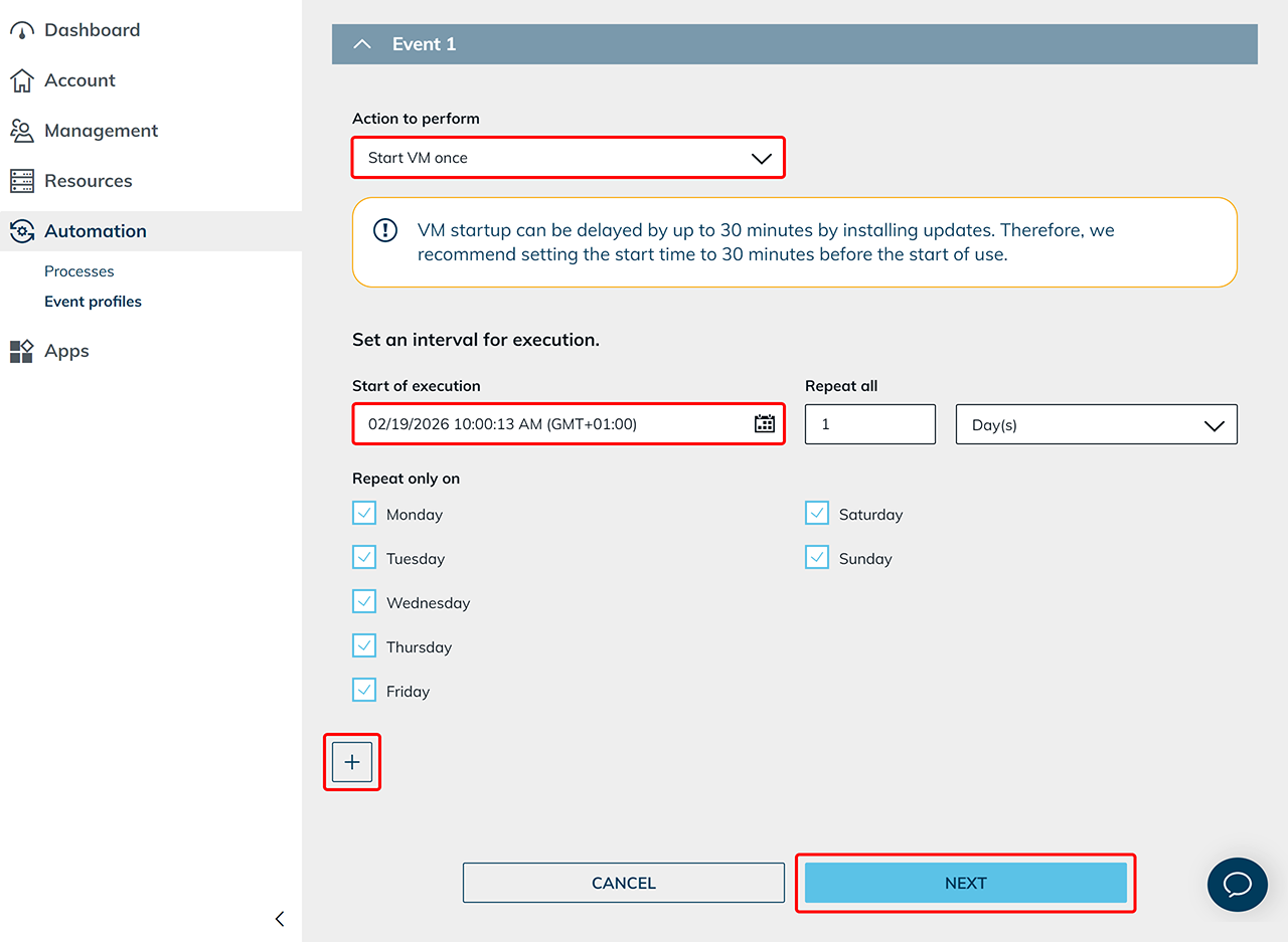 Um unerwartete Kosten zu vermeiden, empfehlen wir immer einen Zeitpunkt zum Stoppen der virtuellen Maschine festzulegen. So verhindern Sie, dass Maschinen unbeabsichtigt über längere Zeiträume, beispielsweise während eines Urlaubs, weiterlaufen.