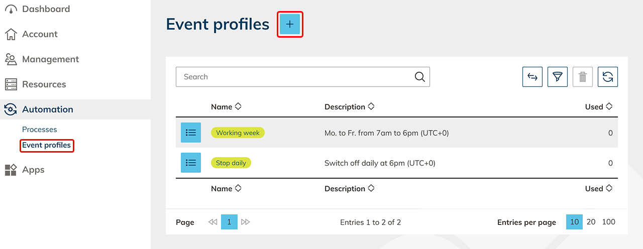 Klicken Sie auf das + Symbol, um ein neues Eventprofil zu erzeugen.