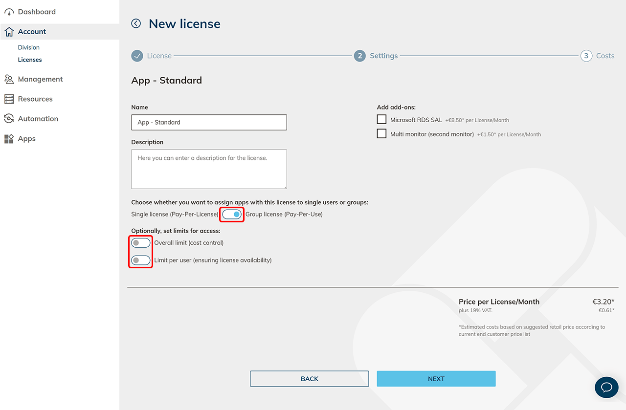 Geben Sie der Lizenz einen beliebigen Namen und wählen Sie so viele App-Lizenzen, wie Sie Apps an Ihre Benutzer vergeben möchten. Bei der Standard-App können Sie einen zweiten Monitor hinzubuchen.