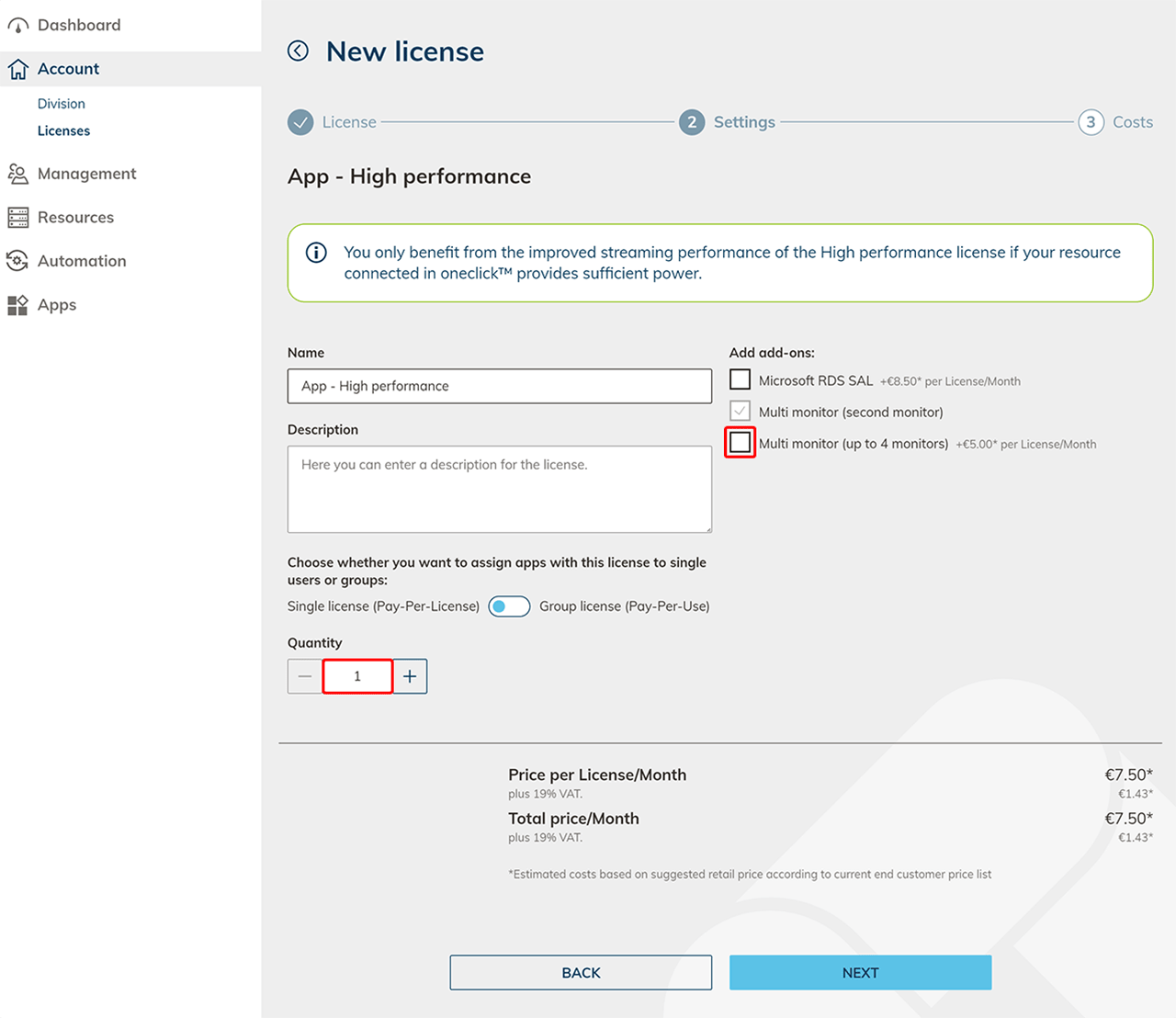 Bei einer High Performance-App ist ein zweiter Monitor bereits enthalten. Sie können das Multi-Monitor Add-On mit bis zu vier Monitoren hinzubuchen. Klicken Sie auf Weiter.