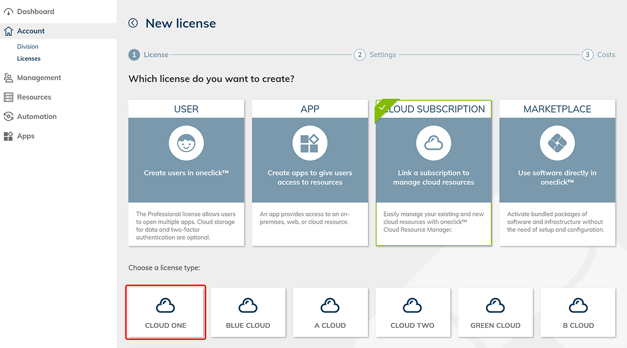 Die Nutzung der Cloud-Lizenz über oneclick™ ist geeignet, um einfache Projekte umzusetzen. Sie können ein Abonnement über oneclick™ anlegen, bei den Ihnen zur Verfügung stehenden Cloud Providern.