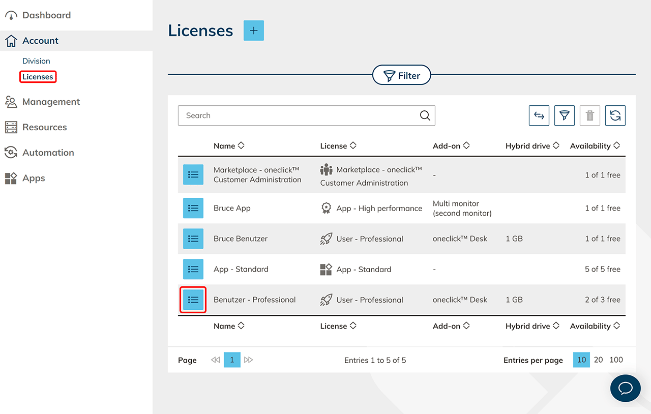 - Gehen Sie auf die Detailseite Ihrer gekündigten Lizenz, mit Klick auf das Listen-Symbol.