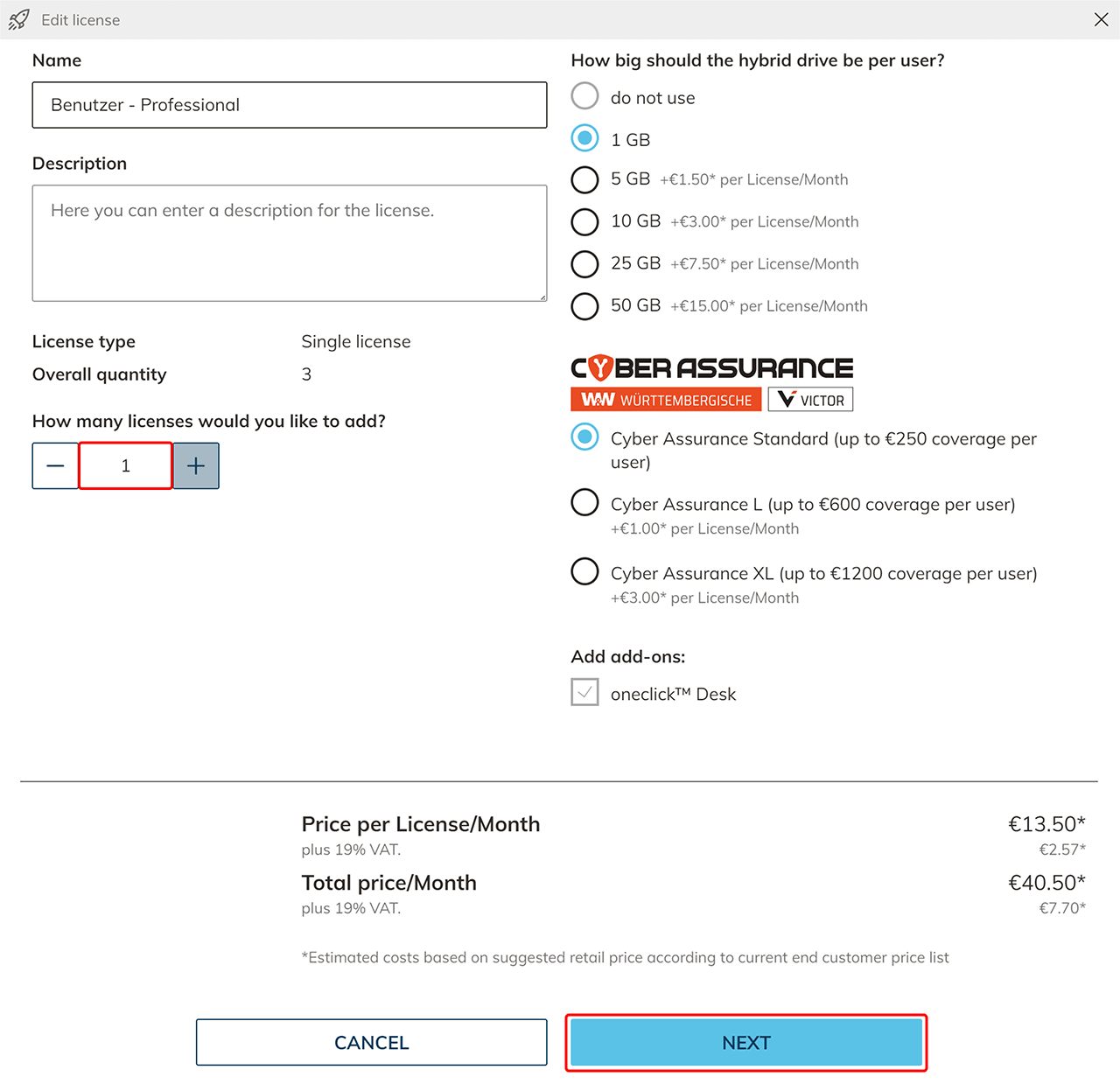 - Geben Sie die Menge der Lizenzen an, die Sie dazukaufen bzw. bei denen Sie die Kündigung rückgängig machen wollen und klicken auf Weiter.