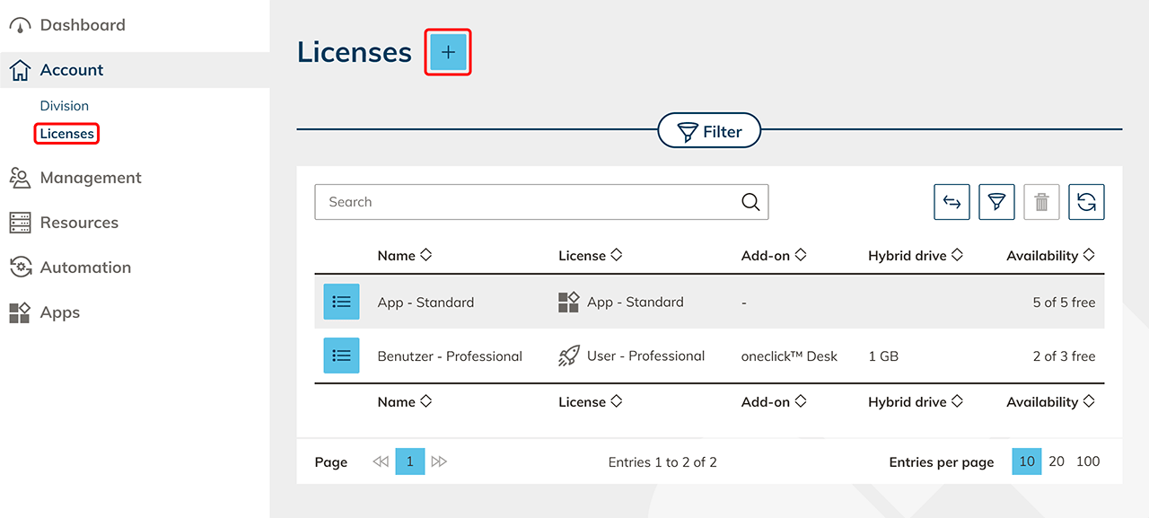 Klicken Sie im Reiter Account auf Lizenzen und dann auf das + Symbol, um eine neue Lizenz zu erstellen.