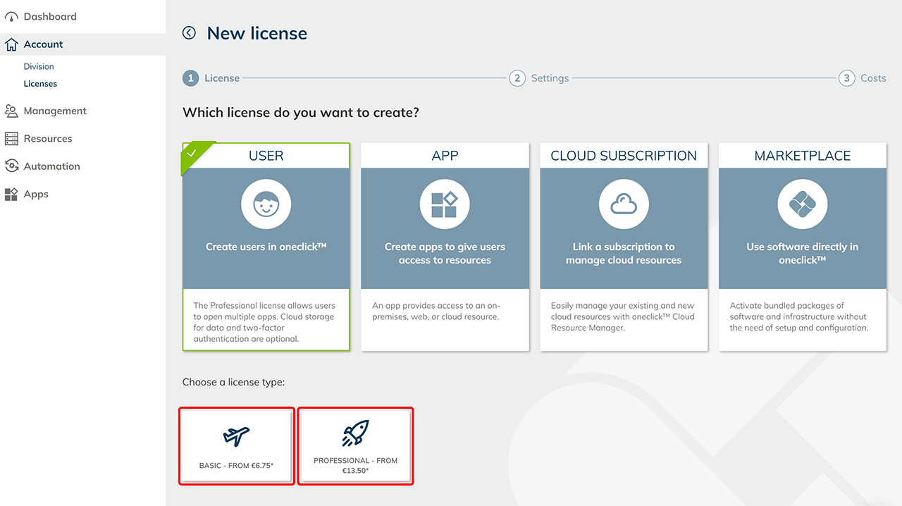 Um einen Benutzer zu erstellen, benötigen Sie eine Benutzer-Lizenz. Ihre Benutzer erhalten dadurch einen Account zu ihrem oneclick™ Workspace. Dieser Workspace besteht nach der Einrichtung entweder aus einer App (Benutzer Basic Lizenz) oder dem oneclick™ Desk (Unified Workspace) (Benutzer Professional Lizenz) auf dem alle zugewiesenen Apps erscheinen.