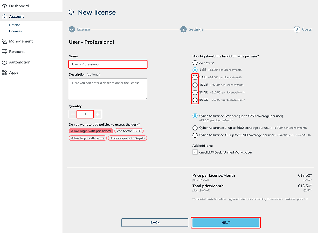 - Professional: Wählen oder kombinieren Sie Richtlinien um z.B. den Login über Identity Provider zu erlauben. Die Richtlinie "Login erlauben mit Passwort" wird beim Kauf einer Lizenz grundsätzlich immer aktiviert und ermöglicht dem Benutzer den Zugriff über seine oneclick™ Zugangsdaten. Beachten Sie bitte unseren Help-Artikel zur Deaktivierung dieser Richtlinie, falls Ihren Benutzern der Zugriff ausschließlich über einen Identity Provider oder ein privates Active Directory erlaubt werden soll. Weiterhin können Sie in diesem Schritt verschiedene Größen für das Hybrid Drive auswählen. Klicken Sie anschließend auf Weiter.