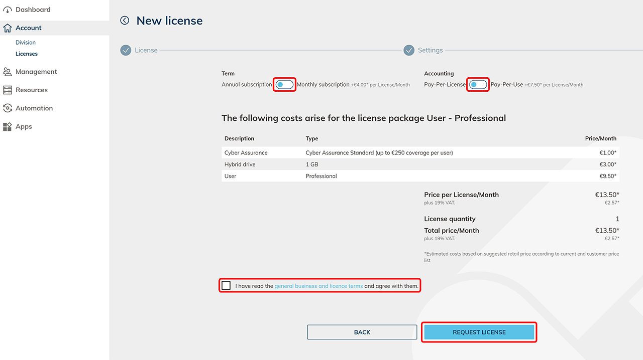Im letzten Schritt können Sie zwischen "Jahres- und Monatsabo" und einem "Festpreis und einer Nutzungsbasierten Abrechnung" wählen und bekommen die unverbindlichen Endkunden Preise aufgelistet. Bei der nutzungsbasierten Abrechnung (Concurrent) werden alle Benutzer des monatlichen "Peaks" berechnet. Das "Peak" ist die höchste Anzahl der gleichzeitigen Zugriffe im Monat. Eine Nutzungsbasierte Abrechnung lohnt sich, wenn nicht mehr als die Hälfte Ihrer angelegten Benutzer gleichzeitig in oneclick™ arbeiten werden. Basic: Bei einer Nutzungsbasierten Abrechnung zahlen Sie, ohne das Hybrid Drive, nur für alle Benutzer des monatlichen "Peaks". Professional: Bei einer Nutzungsbasierten Abrechnung zahlen Sie einen geringen Grundpreis pro Benutzer (im Jahresabo 4€) für die vorgehaltene Infrastruktur des Hybrid Drives. Zusätzlich wird ein Aufschlag (im Jahresabo 16€) für alle Benutzer des monatlichen "Peaks" berechnet. Bestätigen Sie die AGLBs und klicken Sie auf Lizenz anfordern, um den Vorgang abzuschließen.