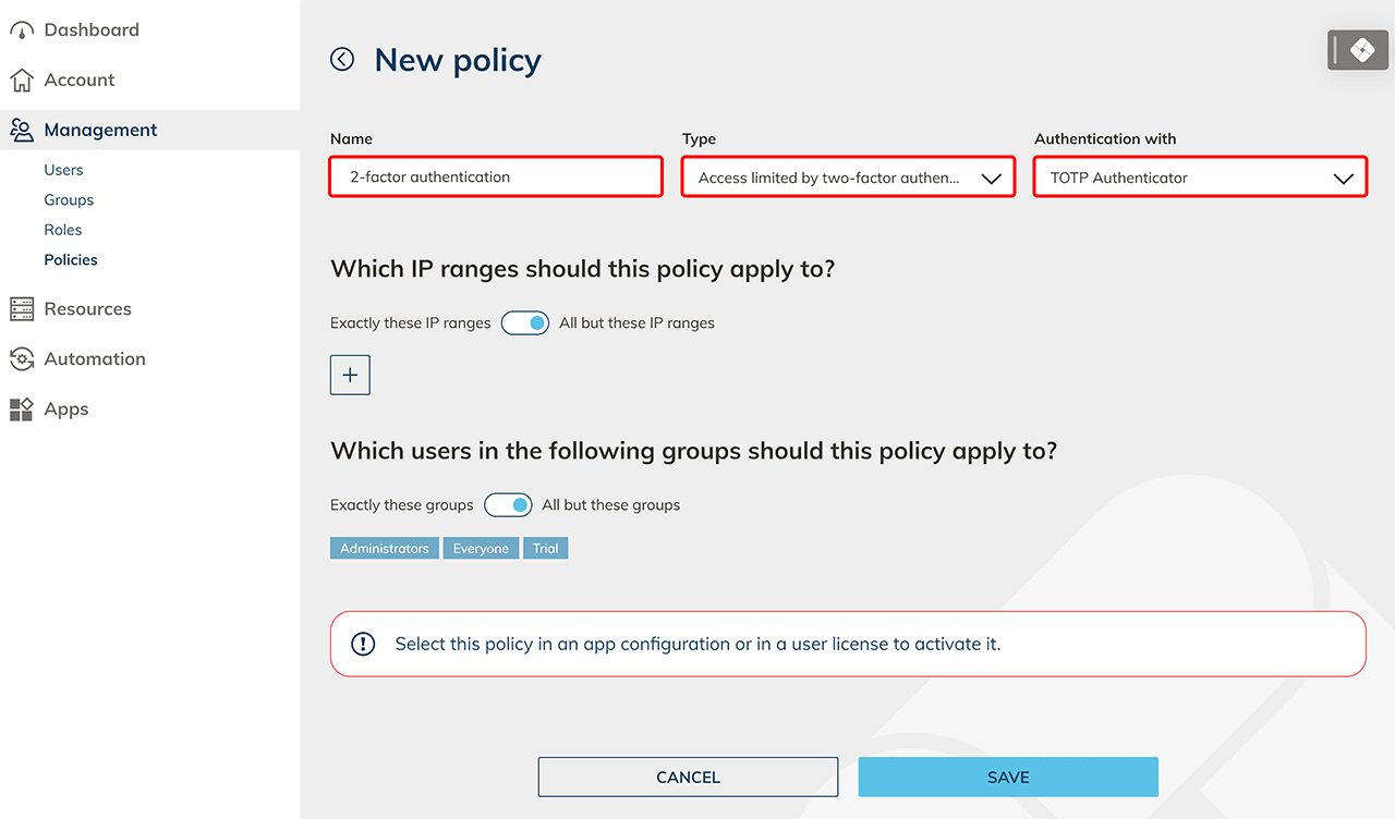 Mit Hilfe von "Richtlinien" können Sie den oneclick™ Unified Workspace oder sensible Apps zusätzlich absichern. Sie können den Zugriff von IP-Adressen/Bereichen verbieten oder mit einer Zwei-Faktor-Authentifizierung beschränken. Sie können später beliebig viele Richtlinien miteinander kombinieren, indem Sie in einer App-Konfiguration oder einer Benutzer-Lizenz mehrere Richtlinien auswählen.