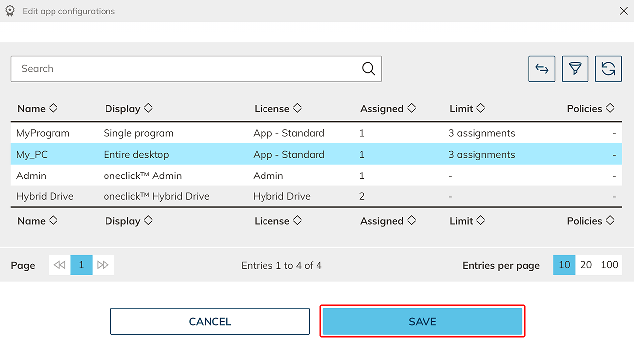 - Wählen Sie eine oder mehrere App Konfigurationen aus und beenden Sie den Vorgang mit Klick auf Speichern. Die Richtlinie greift nun beim Öffnen der App.