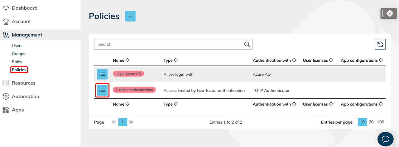 - Gehen Sie auf die Detailseite Ihrer Richtlinie, indem Sie auf das Listen-Symbol klicken.