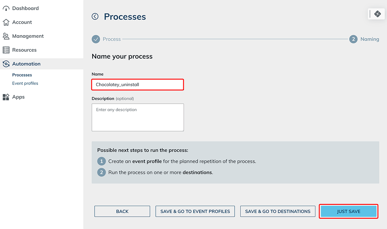 Mit Chocolatey können Sie Software durch einen zentral ausgeführten Prozess auf Ihren Ressourcen ebenfalls deinstallieren. Wir empfehlen hierzu, ein Prozess-Template anzulegen, bei dem dann nach Bedarf jede Software eingetragen werden kann.
