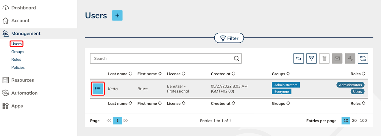 Gehen Sie auf die Detailseite Ihres Benutzers, indem Sie auf das Listen-Symbol klicken.